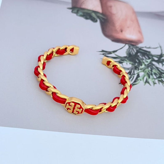 Regular price $64.00 USDRegular priceUnit price / perSale price $64.00 USDTory Burch Marion Logo Woven Leather Cuff Bracelet | Leather and Chain Cuff | Double T Leather Bracelet