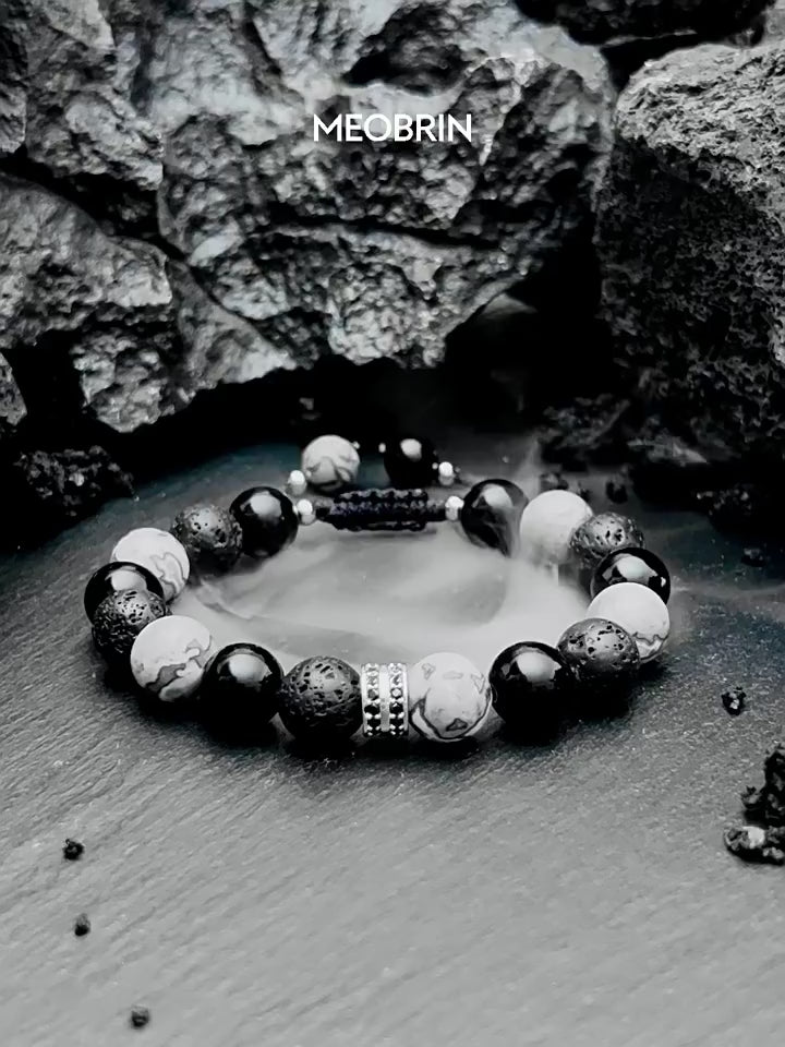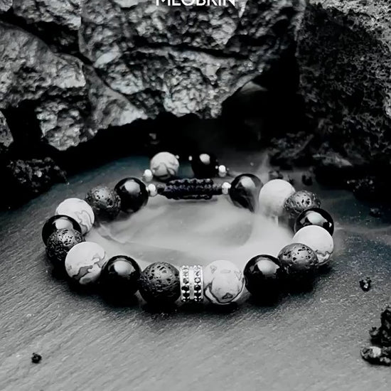 A bold handcrafted bracelet blending black obsidian, Picasso jasper, and lava stone — designed for strength, clarity, and timeless masculine style.