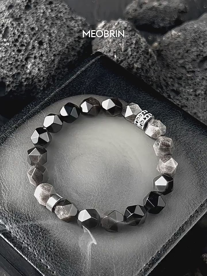 A bold and sophisticated bracelet crafted from natural silver obsidian — designed to exude strength, calm, and timeless masculine style.